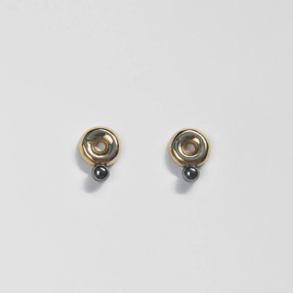 The smaller cousin to our Albers Earrings. Sculpted circular studs in solid brass or silver, set with a half drilled hematite sphere. Anni Studs measure .75" x .5" and weigh 3 grams each. Sterling silver posts and wide silicone comfort backs.